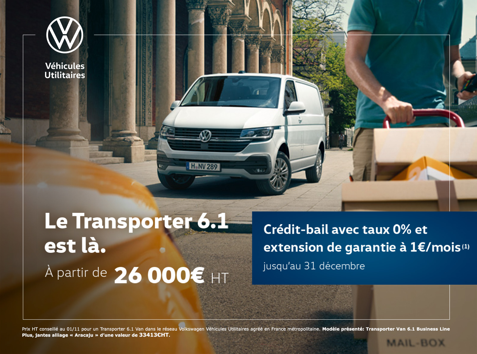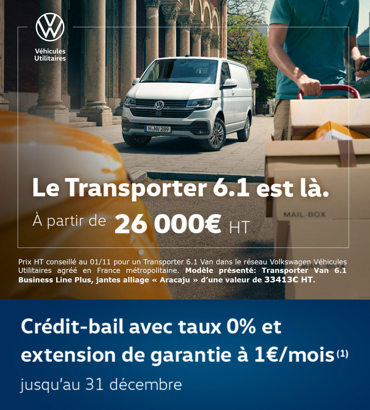 (1) Crédit-bail à 0% sur 36 mois et 90 000km maximum ou 48 mois et 120 000km maximum. Garantie additionnelle incluse dans les loyers : 1€/ mois sur toute la durée du crédit-bail, souscrite auprès d‘Opteven Assurances (société d’assurance et d’assistance, capital 5 335 715 €, siège social 35-37, rue L. Guérin, 69100 Villeurbanne, RCS Lyon n° 379 954 886 régie par le Code des assurances et soumise au contrôle de l’ACP). Offre valable sur Caddy Van, Caddy Maxi Van, Transporter & Crafter pour toute commande passée du 01/10/2019 jusqu’au 31/12/2019 inclus, immatriculée avant le 31/12/2019, réservée à la clientèle professionnelle chez Volkswagen Véhicules Utilitaires présentant ce financement, sous réserve d’acceptation du dossier par Volkswagen Bank GmbH – SARL de droit allemand – Capital 318 279 200 € - Succursale France : Bâtiment Ellipse 15 Avenue de la Demi-Lune 95700 Roissy en France - RCS Pontoise 451 618 904. ORIAS: 08 040 267 . Montants exprimés en HT, hors prestations facultatives. Perte Financière auprès de MMA IARD Assurances Mutuelles (société d‘assurance mutuelle à cotisations fixes - RCS Le Mans 775652126) et MMA IARD (S.A. au capital de 537 052 368 € - RCS Le Mans 440 048 882 - 14 bvd Marie et Alexandre Oyon, 72030 Le Mans cedex 9), entreprises régies par le code des assurances. Les outils d’aide à la conduite ne dispensent pas le conducteur d’être vigilant.